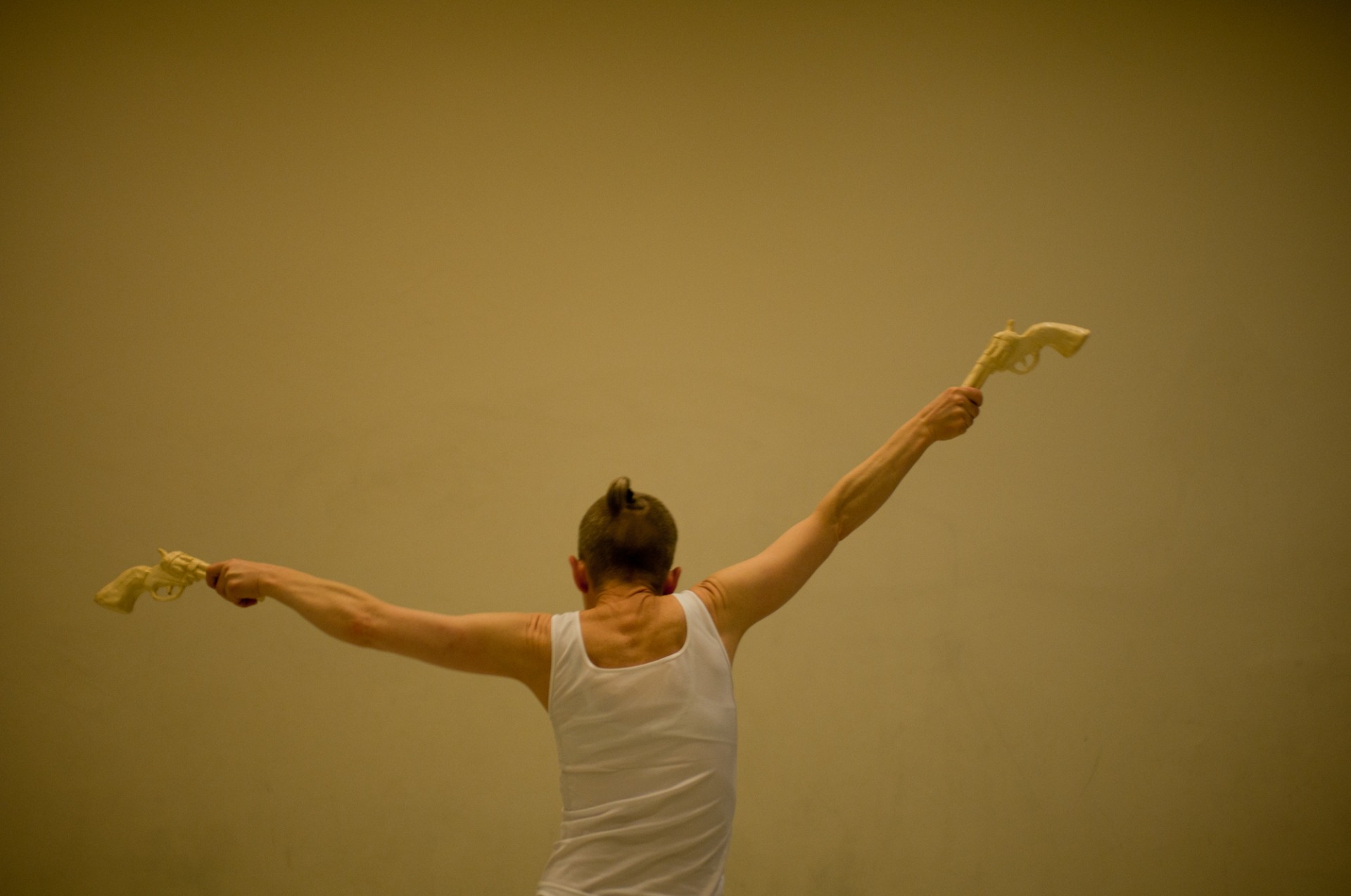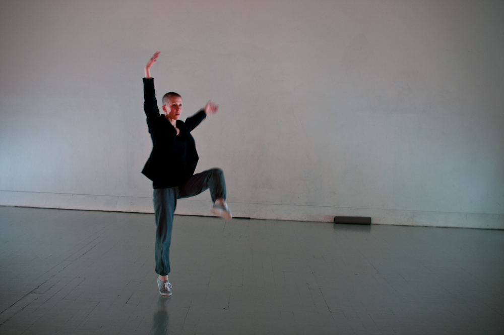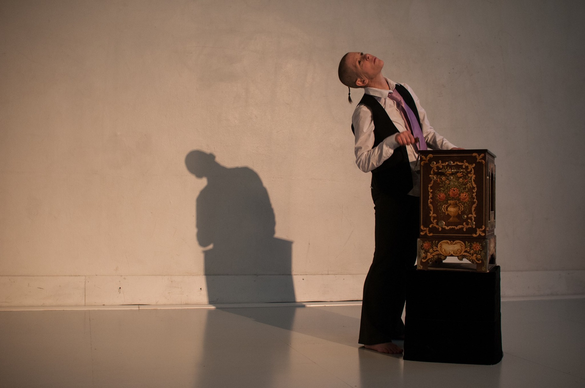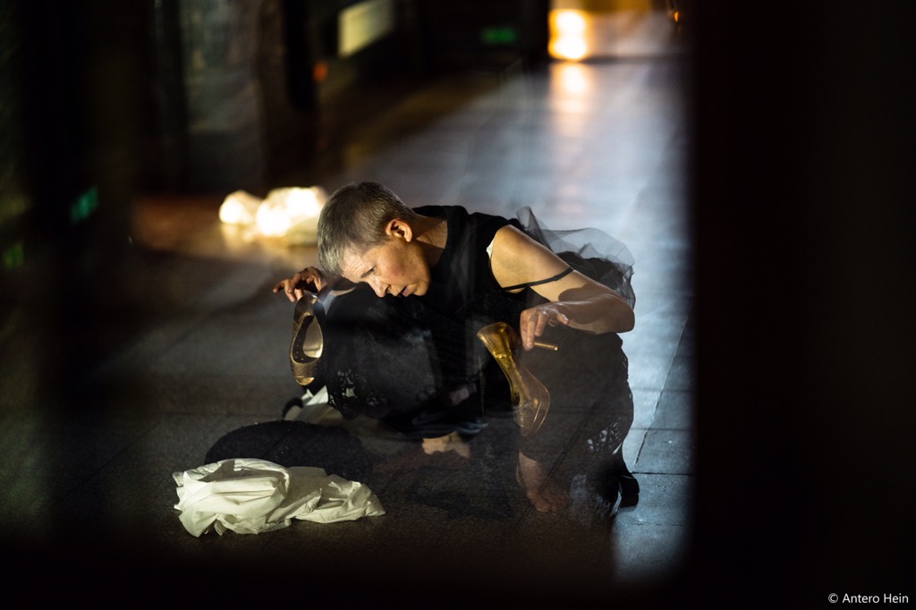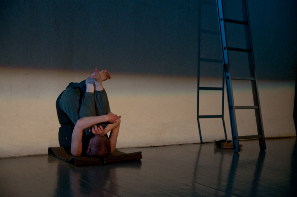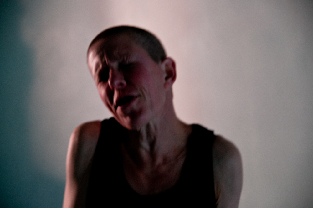 Portrett fra 'Usannsynlig' (2010). Konsept/regi/utøver. Bevegelse/stemme. Solo dans i samarbeid med Tov Ramstad (musikk), Turid Ousland (scenografi og rekvisitter), Elisabeth Kjeldahl Nilsson (lys). Tema: Døden og det underlige livet!, med utgangspunkt i tekstfragmenter av Michel Houellebecq og Samuel Beckett. Visninger på Scenehuset og på Litteraturhuset. Foto: Elisabeth Kjeldahl Nilsson