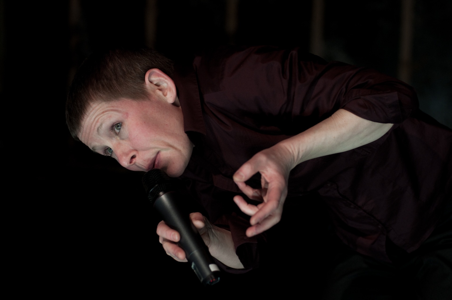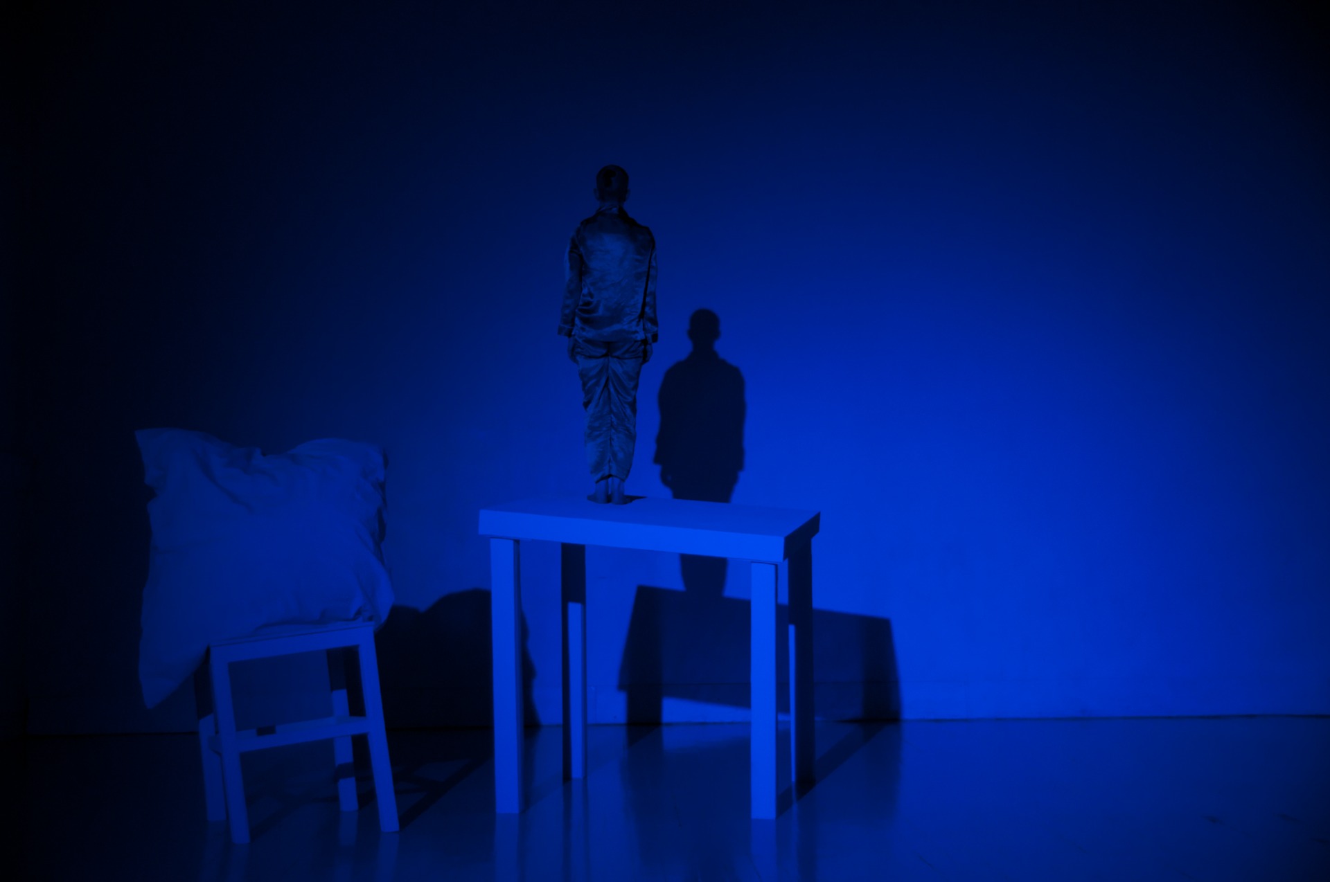 Foto fra 'I bunn og grunn - en slags kabaret om blant annet kjærlighetssorg', 2016. Øvrige medvirkende: scenekunstnerne Lars Jacob Holm, Kristine Karåla Øren og Kate Pendry, scenograf og lysdesigner Elisabeth Kjeldahl Nilsson, videodesigner Sabina Jacobsson, og koret Homofonien under ledelse av Ingrid Støylen Runde. Foto: Elisabeth Kjeldahl Nilsson