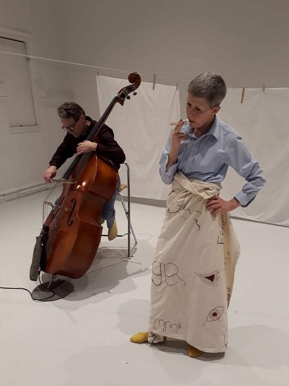 Fra 'Absolutt uten tittel', 2014. Med musiker Hege Rimestad. Scenografi: Turid Ousland. Foto: Elisabeth Kjeldahl Nilsson