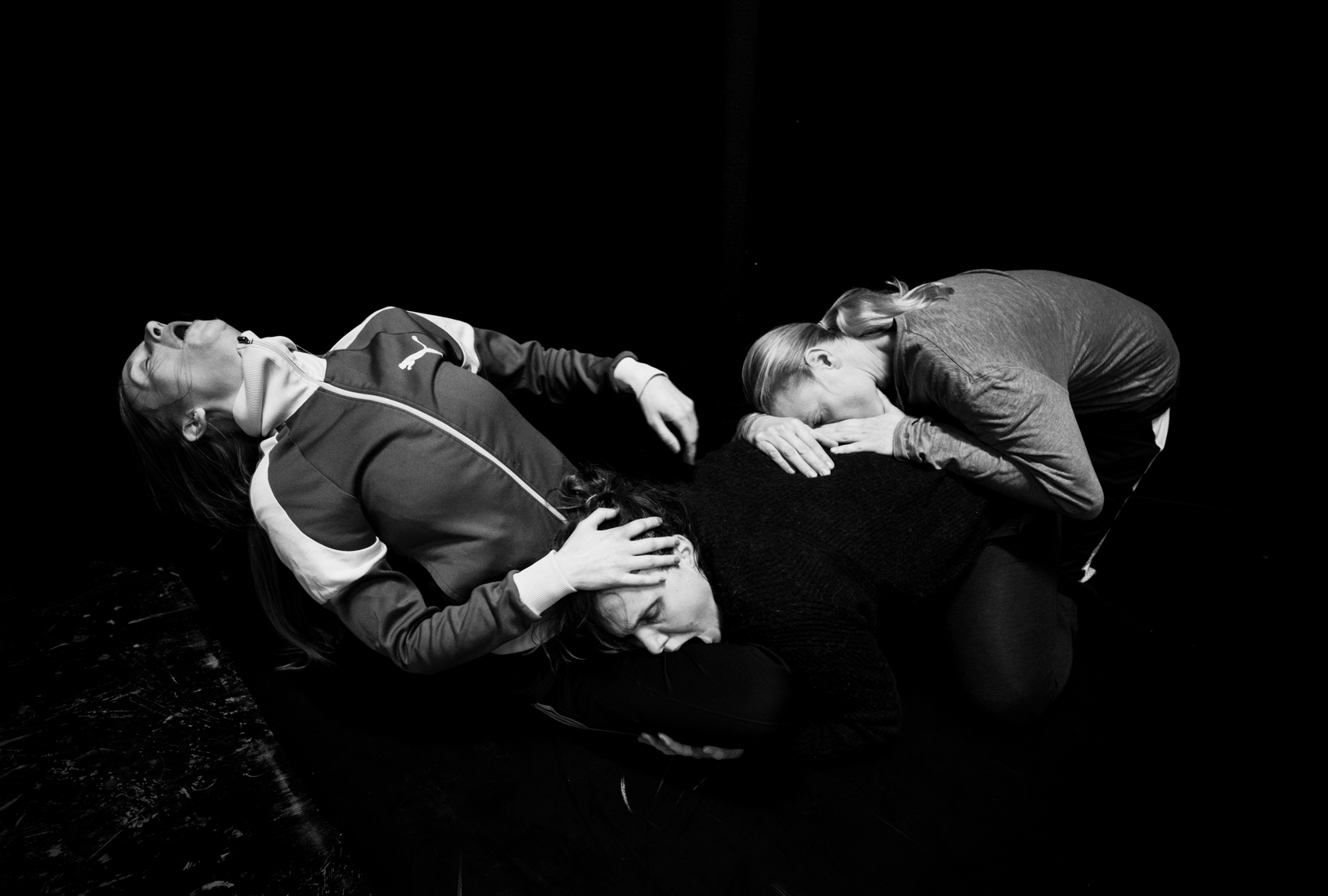 Hvordan kropp og stemme henger sammen er en av mine hovedinteresser, og i 2018 initierte og ledet jeg 'alfabet' med dette som tema. Med danserne Marianne Kjærsund, Ida Gudbrandsen og Kristine Øren, musiker Tov Ramstad og scenograf Elisabeth Nilsson. Vist på Rom for Dans samt på Nesodden bibliotek. På bildet: Ida, Kristine og Marianne. Foto: Elin Osjord