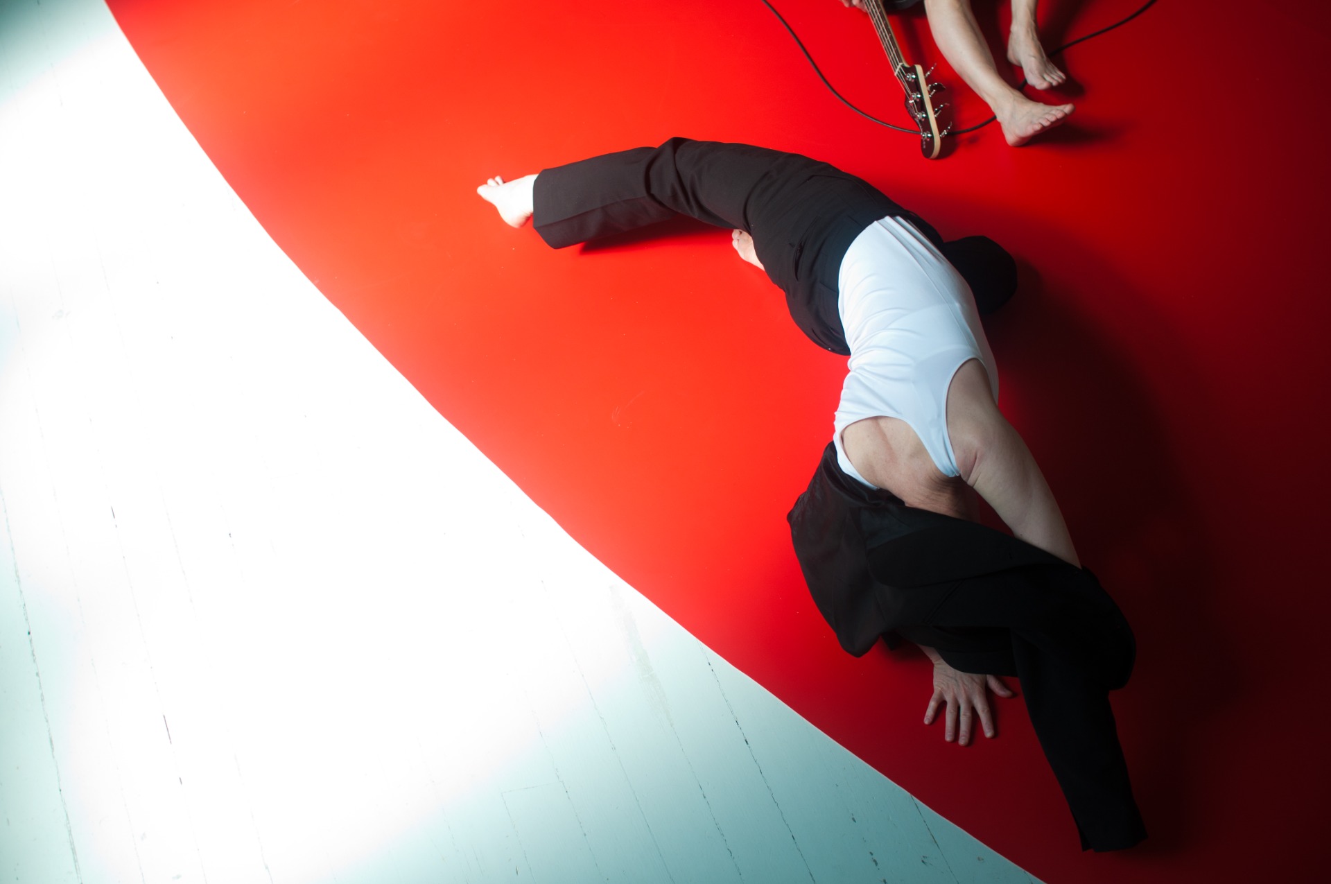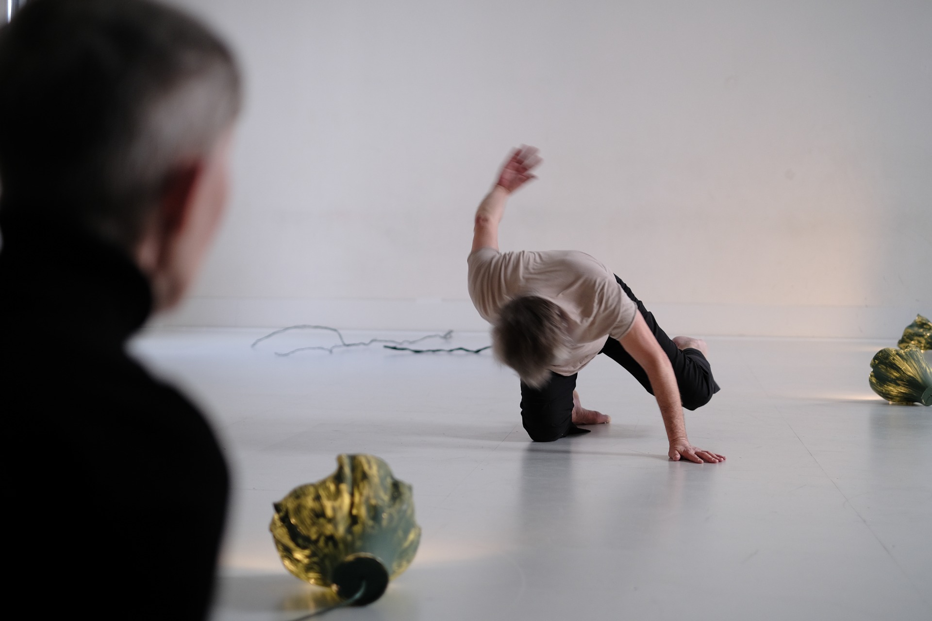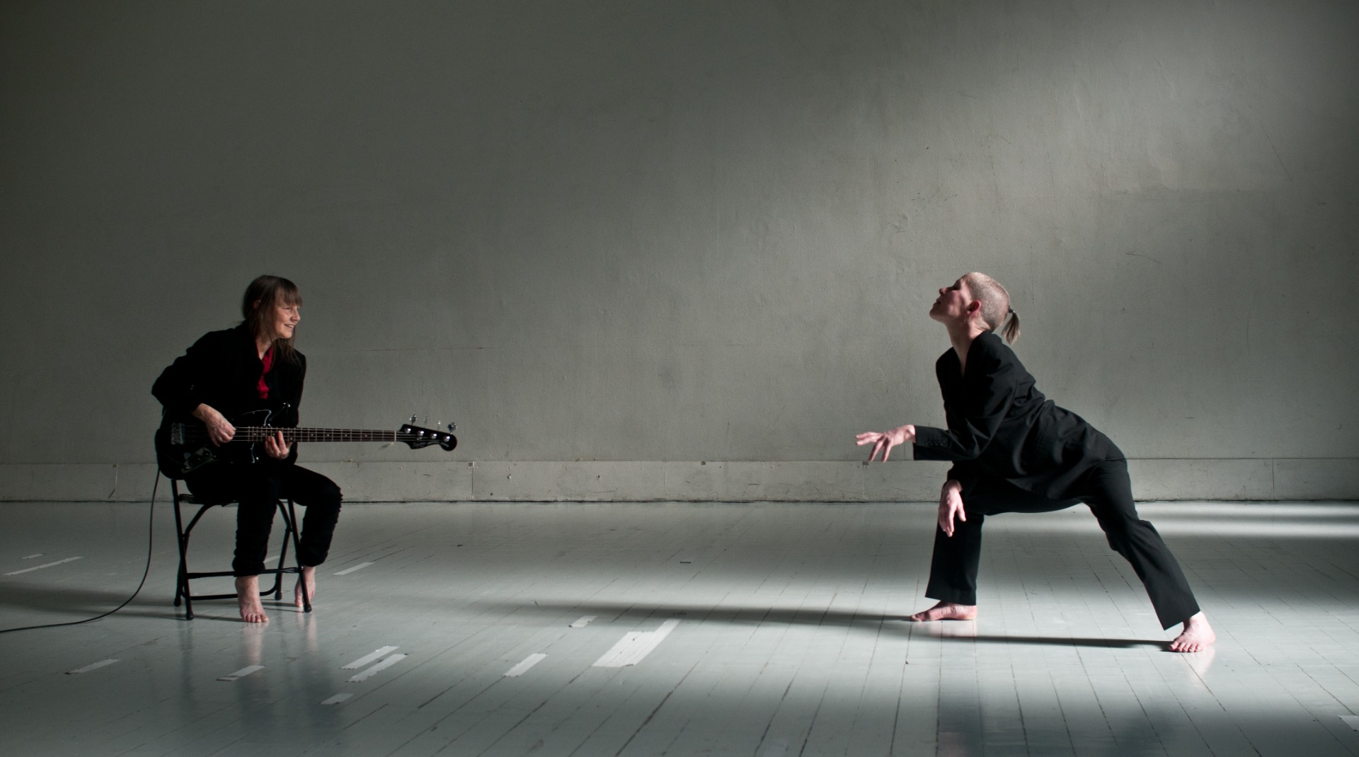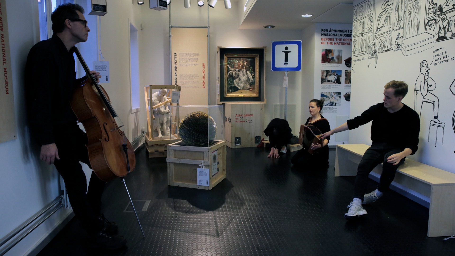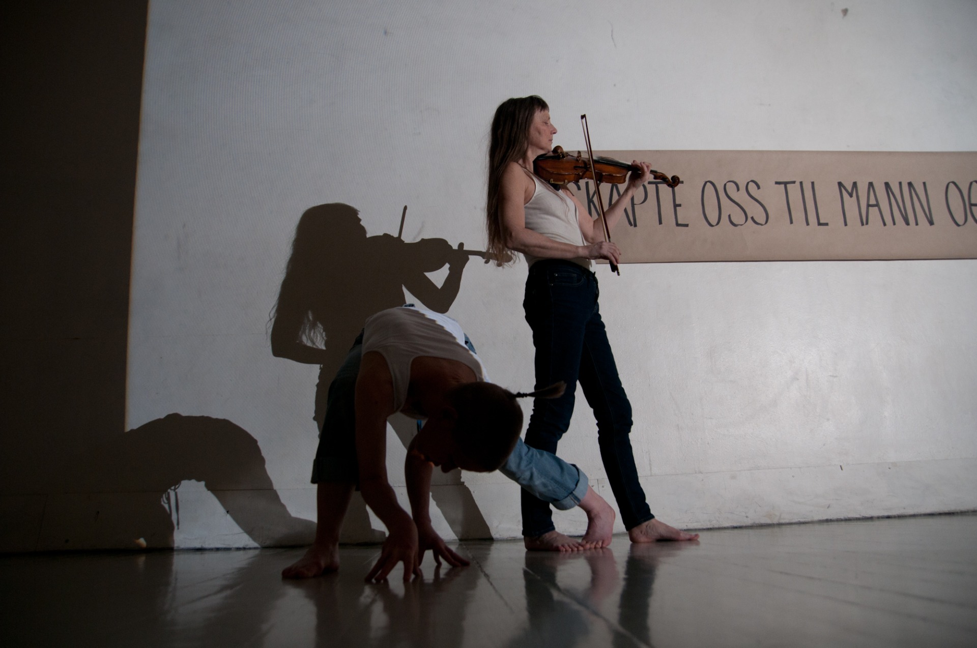 Fra 'Mellom rom' (2016), et stedsspesifikt improvisasjonsprosjekt på Nasjonalmuseets 'Mellomstasjon' på Vestbanen, i samarbeid med dansekunstner Magnus Myhr og musikerne Tov Ramstad og Hilde Fjerdingøy. Foto: Turid Ousland