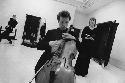 'Du vassar rundt i kroppen din heile dagen' - et samarbeidprosjekt ved poet Brit Bildøen, dansekunstner Hild Rustad, musiker Tov Ramstad og meg. Her fra en visning på Museet for Samtidskunst i 2004, i installasjonen " Body and Image " av Pistoletto.