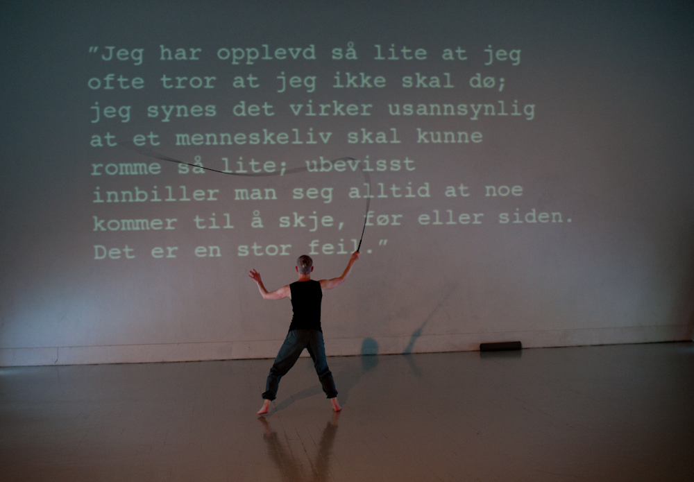 'Usannsynlig' (2010). Konsept/regi/utøver. Bevegelse/stemme. Solo dans i samarbeid med Tov Ramstad (musikk), Turid Ousland (scenografi og rekvisitter), Elisabeth Kjeldahl Nilsson (lys). Tema: Døden og det underlige livet!, med utgangspunkt i tekstfragmenter av Michel Houellebecq og Samuel Beckett. Visninger på Scenehuset og på Litteraturhuset. På bildet tekst av Michel Houellebecq. Foto: Elisabeth Kjeldahl Nilsson