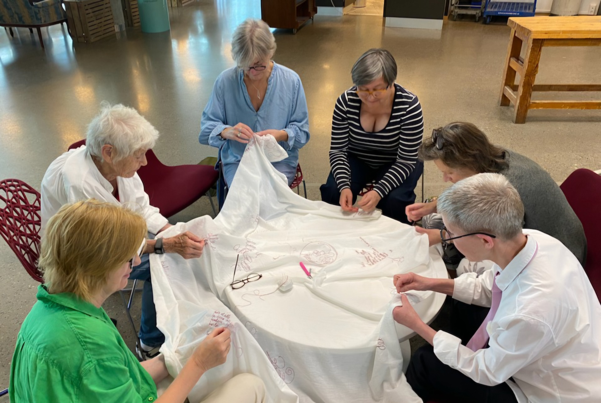 Du er velkommen til å slå deg ned en stund, slå av en prat eller bare sitte stille, kanskje bidra til broderiet. Fellesskapet og fantasien står i sentrum.